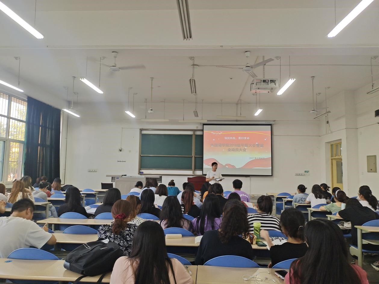 王业青副书记介绍了学院2021届毕业生就业工作基本情况,分析2022届毕业生的就业形势,积极引导学生尽早尽快确定就业方向,明确就业目标,对2022届毕业生进行了就业动员。面对疫情带来的就业形势的变化与影响,王业青副书记要求同学们务必提前谋划,选择合适的就业目标方向,积极做好个人简历,打磨提升自己的面试技能,充分利用好网络资源,关注学院和学校推荐的就业信息,团队共享资源,切实用昂扬积极的状态投入2022届就业招聘工作中。随后,王业青副书记对2018级本科生提出了三点希望,一是要坚定就业信心,认清就业形势,做到务实、理性的求职和择业;二是要认清考研、考公、考编和就业齐步走的重要性,放平心态,明确目标,避免消极懈怠心理、焦虑胆怯、盲目从众心理,不好高骛远;三是要有投身西部建设的大局观念,选择到祖国建设需要的地区去,用实际行动响应习近平总书记对青年人的号召,选择军营,选择西部计划,选择能够建功立业的岗位去奋斗,去实现自己的理想。