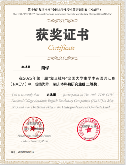 近日,第十届“复旦社杯”全国大学生学术英语词汇赛(The10th“FDPCup”CollegeAcademic English Vocabulary Competition)圆满落幕。我校胡佳美、喻越、石锐东等25名同学荣获一等奖,梁旗凯、杨晨曦、史沐涵等25位同学获得二等奖,张晨萱、邓文杰、任依婷等39位同学获得三等奖。