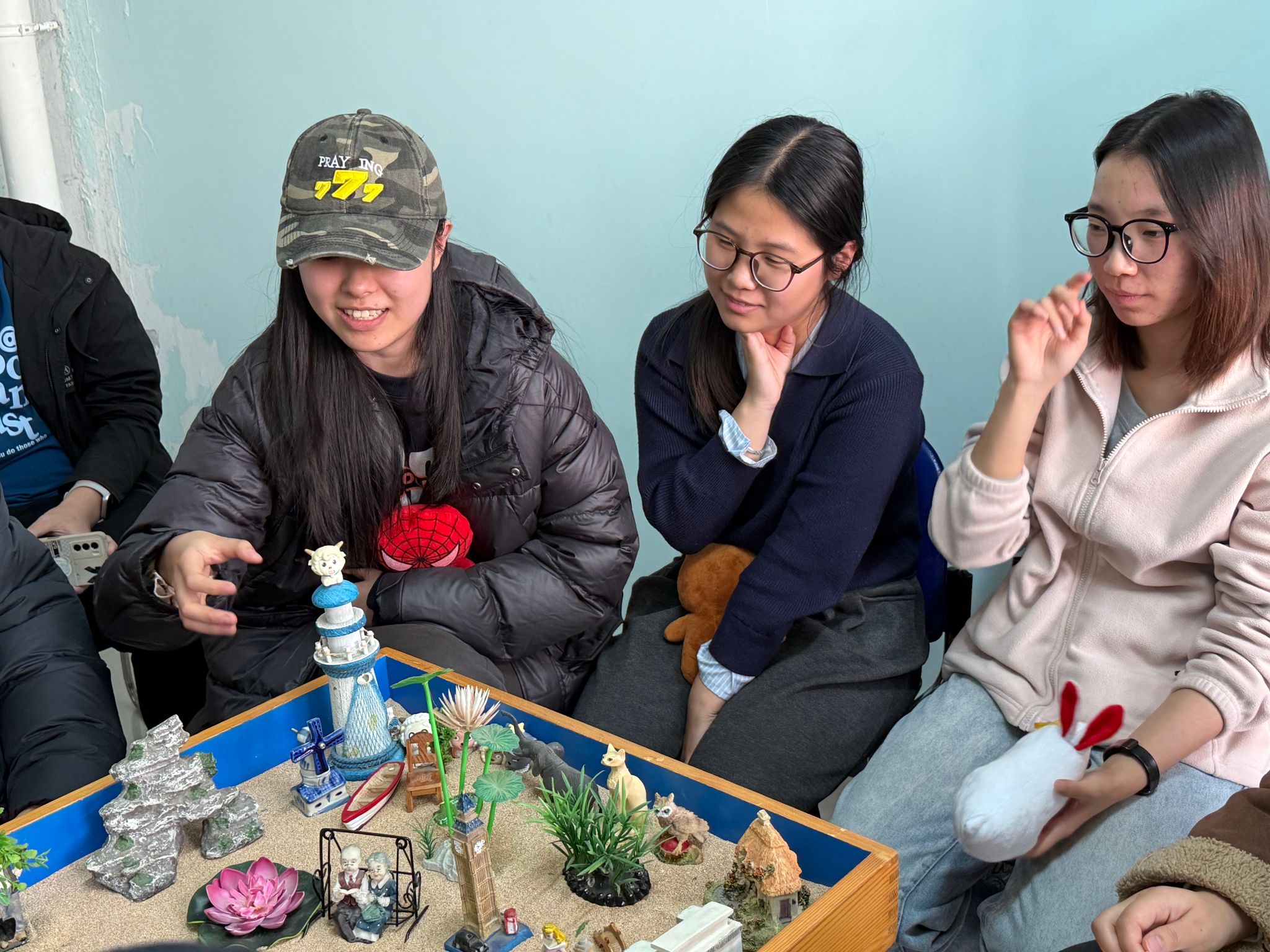 在沙盘心理测试与分享交流环节,学生在闫老师的分组引导下走进心理沙盘室。大家面对陈列架上涵盖人物、建筑、自然、交通等多个类别的数百件沙具,暂时放下复习的疲惫,遵循内心直觉挑选沙具,在特制沙盘内通过堆沙、摆放道具等方式,构建出专属的“心理图景”。过程中,心理老师全程跟进观察,细致记录学子的沙具选择顺序、摆放位置及情绪变化,为后续的解读交流积累基础。