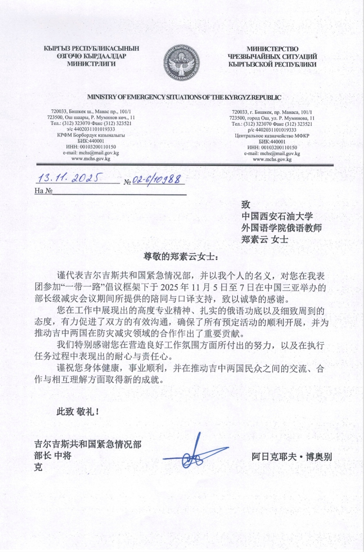 外语教师优秀的国际服务素养。吉尔吉斯共和国应急管理部部长及其代表团对其工作给予高度认可,并在返程后专门致信表示感谢。
